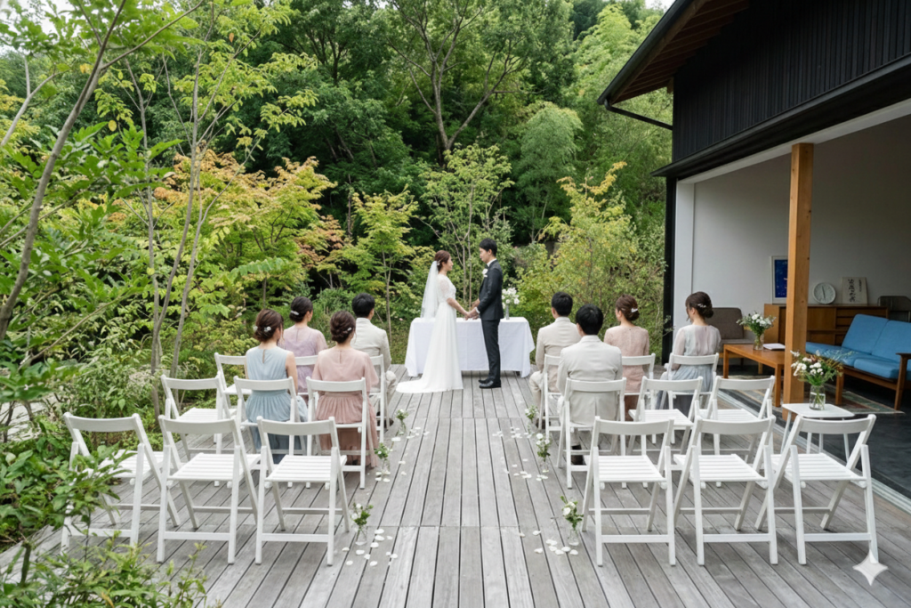 挙式は近くの神社での神前式やレストランのお庭・建物内で人前式を行うことができます。